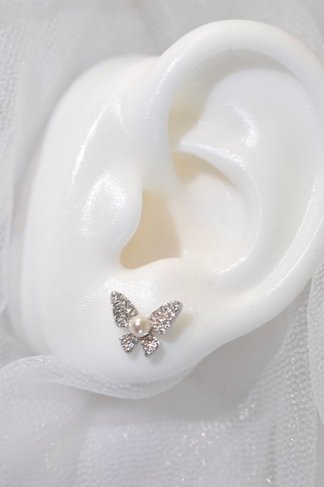 洗練された美しさと華やかさを兼ね備えた、バタフライモチーフのピアス。小ぶりながらも輝きを放つデザインは、繊細なパールが中心に輝き、優雅でありながらも可愛らしさを引き立てます。